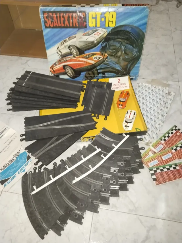 Detalles del productoCircuito de Scalextric con varias pistas y 2 coches(40 € cada uno).