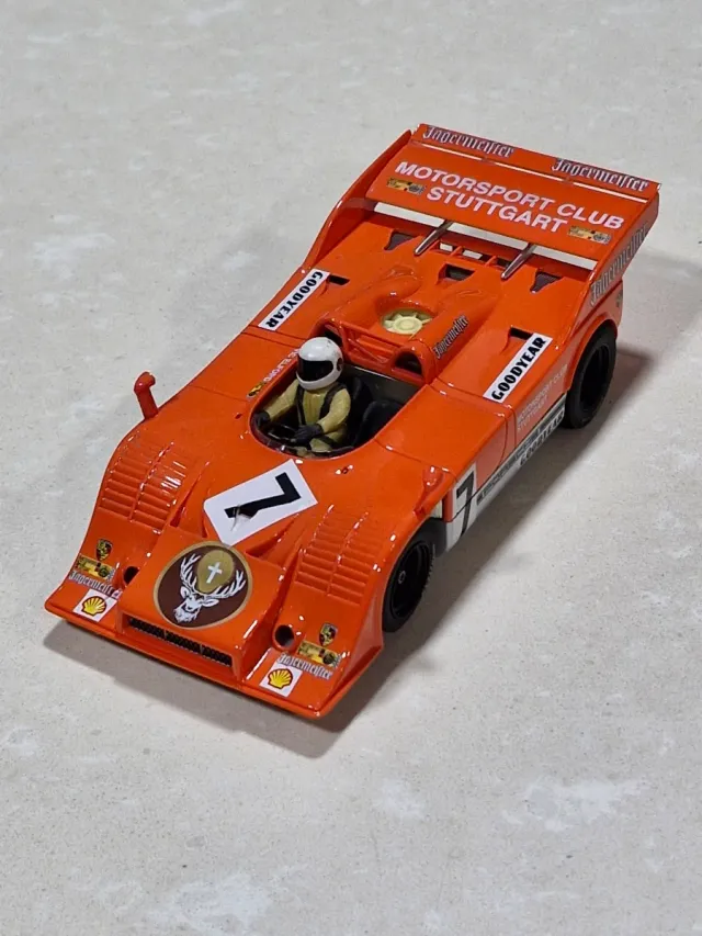 Coche de slot Scalextric Porsche 917K. - Decoración Jägermeister. - Número de dorsal 7. - Escala 1:32.
