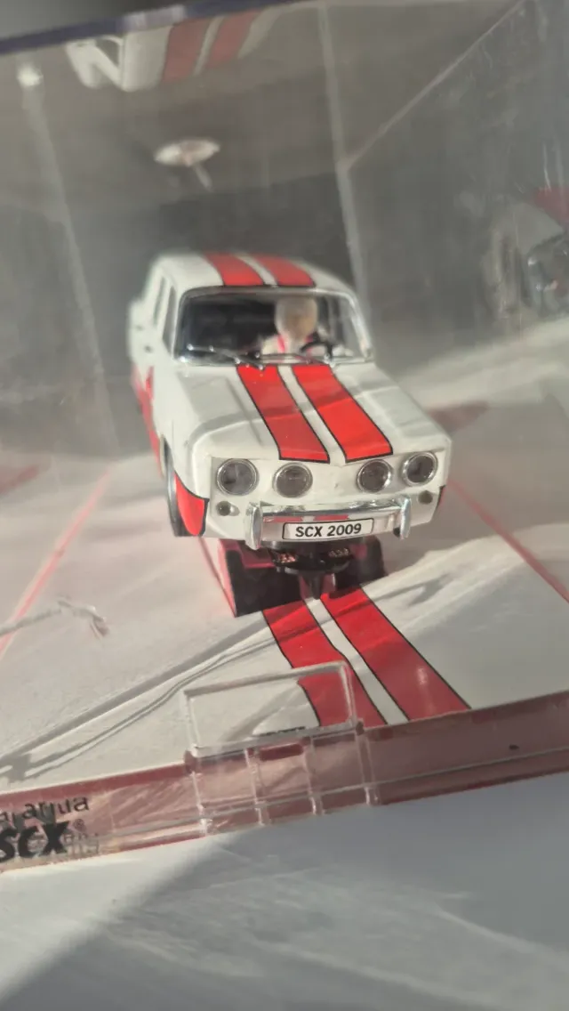Detalles del productoCoche de Scalextric modelo Renault 8 con dorsal SCX 2009. Presenta un diseño clásico en blanco con franjas rojas.