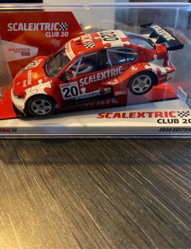 Coche de slot Scalextric Club 20, edición 2020. - Diseño puzzle rojo y blanco. - Número 20 en las puertas y techo. - Incluye alerón negro. Sin abrir