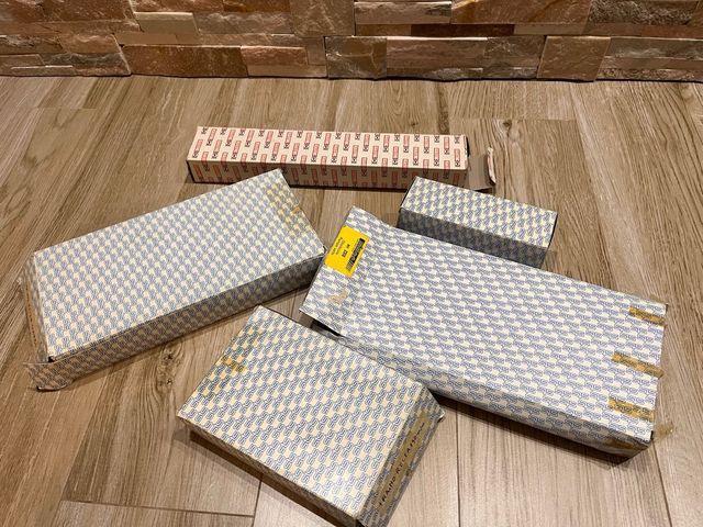 Conjunto de pistas y complementos para Scalextric STS 4x4. - Incluye varias cajas de pistas y accesorios. - Patrón de diseño repetitivo en las cajas.