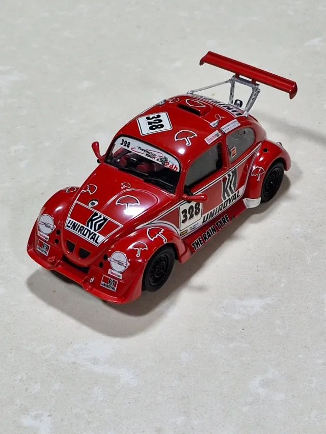 Coche de slot Scalextric con decoración Uniroyal. - Diseño de competición. - Color rojo vibrante. - Detalles de patrocinadores.
