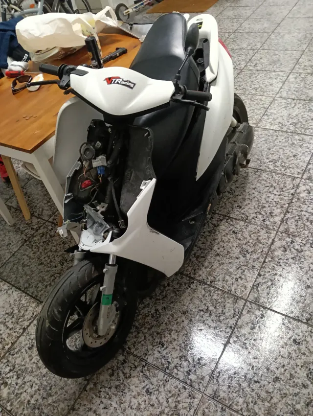 Scooter de color blanco con detalles en negro. - Diseño deportivo. - Asiento negro. - Rueda delantera con disco de freno.