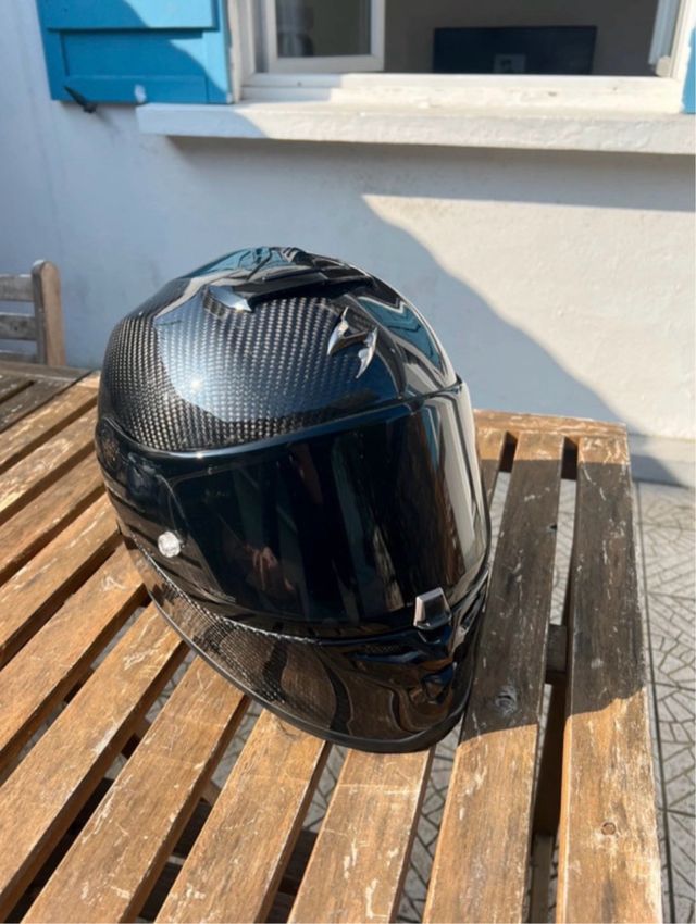 Casco integral Scorpion Exo R1 con acabado en carbono. Talla M - Diseño deportivo y aerodinámico. - Visera oscura incluida.