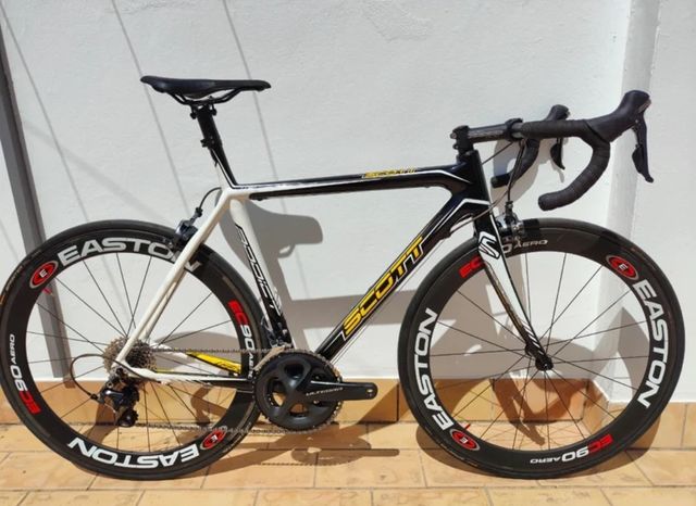 Talla M (54). Peso real sin pedales: 6,76 kg. Cuadro carbono hmx, tope gama scott. Ruedas Easton EC90 Aero. Tubulares Continental Sprinter 25mm. Grupo Ultegra 10v. Zapatas de freno swisstop amarillas. Cierres controltech titanio. Bielas nuevas ultegra 52-36 de 172.5mm. Cadena nueva. Cassette 11-32. Sillín Fizik.