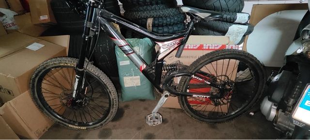 • Cuadro de aluminio de doble suspensión, muy resistente, talla estándar downhill.