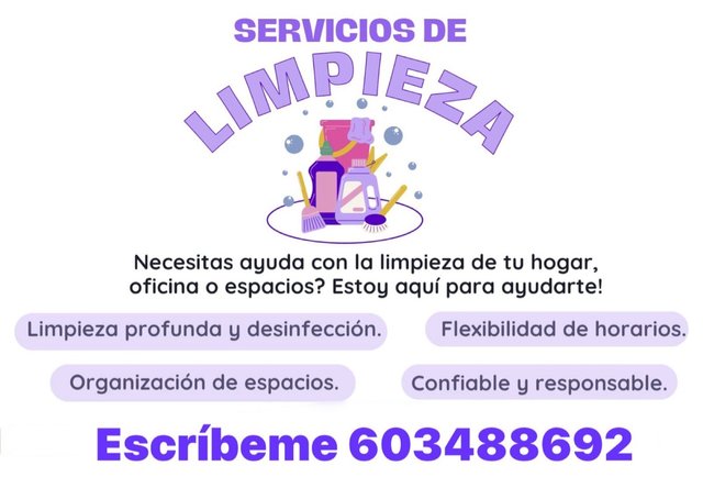 Se ofrece servicios de limpieza general, para tu hogar, oficina o negocio. Cambio de casa / piso Organización de mudanzas No menos de dos horas