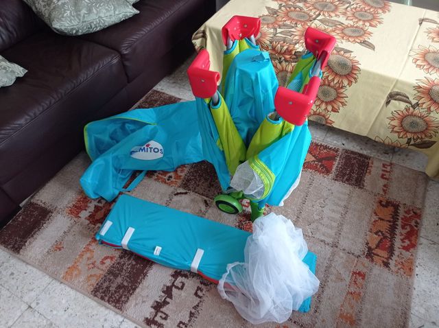 Detalles del productoSe vende cuna de viaje cuadrada utilizable como parque infantil, marca Olmitos. Tiene ruedas en un eje y frenos para que no se mueva. En perfecto estado, poco uso. Incluye mosquitera nueva a estrenar e instrucciones. Muy fácil de montar y desmontar.