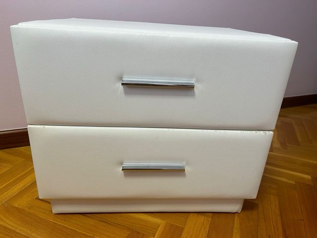 Detalles del productose vende dorimtorio consta de 2 mesillas cabecero y canape de 135*190 de polipiel blanca una de las mesillas en un cajon tiene unos arañazos de una gata como se puede ver en las fotos solo las mesillas constaron 500euros se adjunta factura en foto el conjunto fue a 1300 porfavor solo realmente interesados Medidas del producto