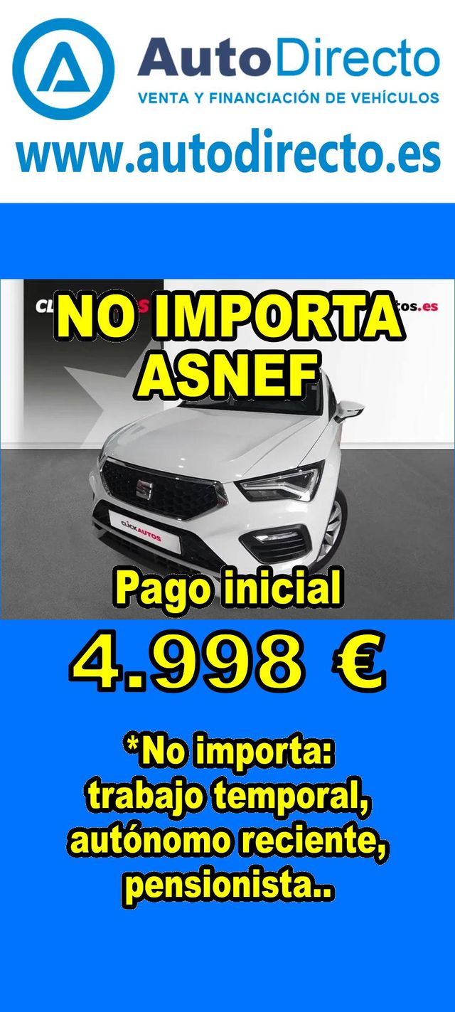 Detalles del producto¿No consigues financiación? ¡Tenemos la solución! RENT CREDIT (Alquiler con opción a compra) *************************************************************************** ✅ Aprobamos más del 95% de las operaciones. ✅ No importa ASNEF o RAI, impagos pendientes, ser autónomo o empresa reciente, ser pensionista. ✅ Imprescindible aportación inicial del 20%. ✅ Ejemplo de operación: SEAT ATECA 1.5 ECOTSI 150CV STYLE EVO EDITION. Ref. W951307MXK - Precio vehículo: 24990 €. - Aportación inicial de 4998 €. - Cuota mes desde 519 €. ✅ Impuesto de circulación y garantía de 1 año incluidos. *************************************************************************** ✅ Más de 3.000 VEHÍCULOS EN STOCK. ✅ Kilómetros certificados. ✅ 17 concesionarios repartidos en toda España. ♻️ Aceptamos tu coche como parte de la operación. *************************************************************************** IMPORTANTE: -. Este anuncio, no es vinculante, puede contener errores. SE MUESTRAN A TÍTULO INFORMATIVO Y NO CONTRACTUAL. -. Consultar disponibilidad del vehículo y datos exactos: fecha de matriculación, importes, etc,... *************************************************************************** Te ofrecemos distintas opciones: Venta al contado, financiación, renting, RENT CREDIT (Alquiler con opción a compra).