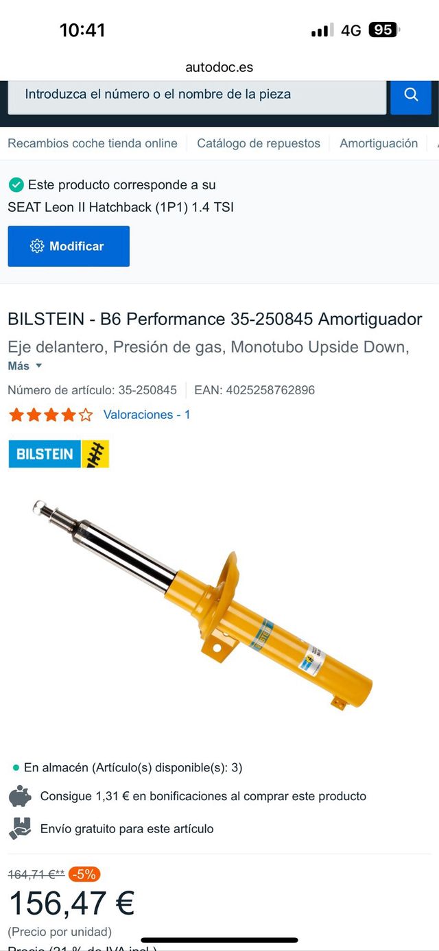 Detalles del productoVendo dos amortiguadores delanteros nuevos, o uno suelto, uno se intentó poner y no era para mi modelo de coche, por eso los vendo, no los puedo devolver porque al intentar instalarlo se hizo un pequeño arañazo en uno de ellos, bilstein b6, comprados en AUTODOC hace una semana, son los de 50mm de grosor