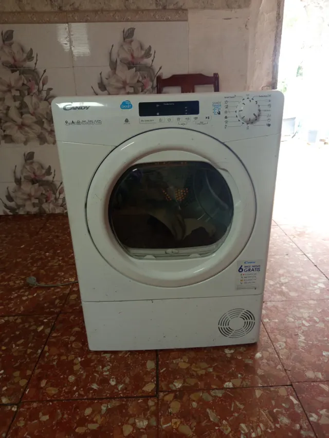 Detalles del productoSecadora de carga frontal de la marca Candy. Su diseño es blanco y cuenta con un panel de control superior.