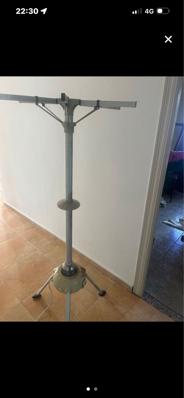 Secadora de ropa vertical con base de trípode. - Estructura metálica. - Base con motor y patas de apoyo. - Diseño plegable para fácil almacenamiento.