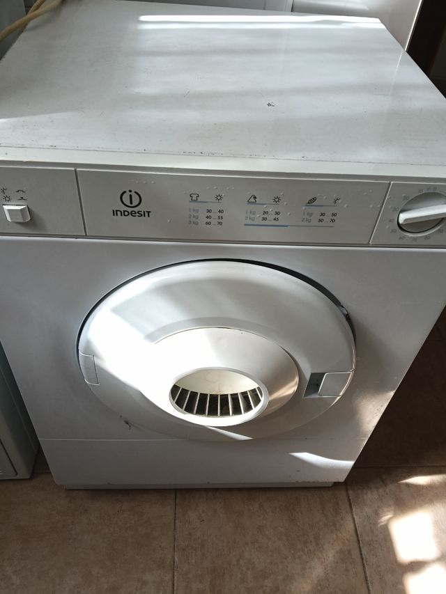 Secadora de carga frontal de la marca Indesit, ideal para espacios reducidos. - Diseño compacto y blanco. - Panel de control con programas y temperaturas.