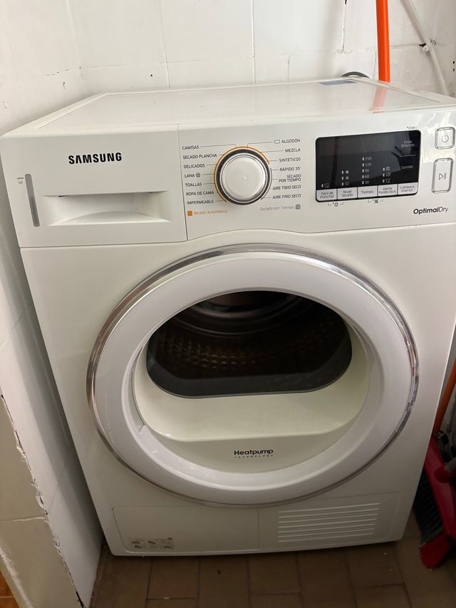 Detalles del productoSecadora de carga frontal Samsung con tecnología Heatpump y sistema OptimalDry. Su diseño es blanco y cuenta con un panel de control digital.