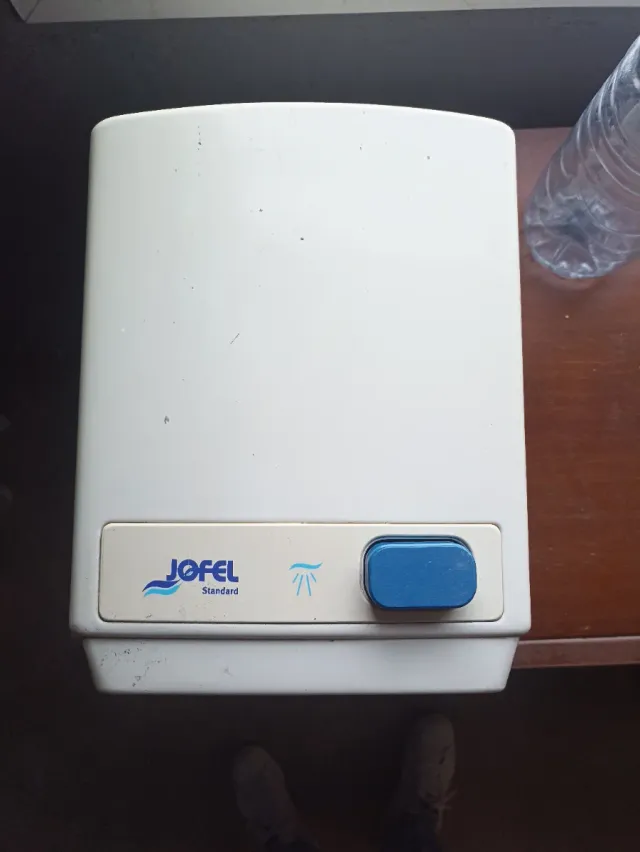 Secamanos de aire caliente de la marca Jofel, modelo Standard. Su diseño es blanco y compacto, con un botón de activación azul.