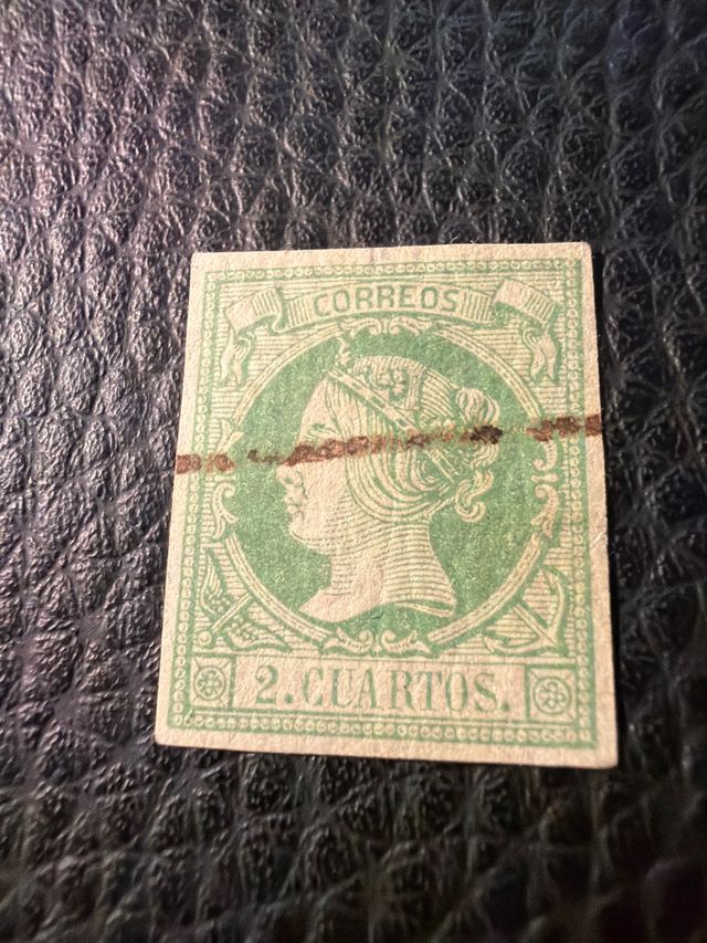 Sello de correos antiguo, correspondiente a la emisión de Isabel II del año 1860. - Referencia Edifil: 51. - Color verde. - Valor facial: 2 Cuartos.