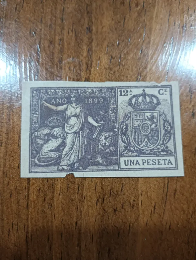 Sello fiscal español con valor de 1 peseta, emitido en el año 1899. - Diseño detallado con escudo y figura alegórica. - Inscripción UNA PESETA en la parte inferior.