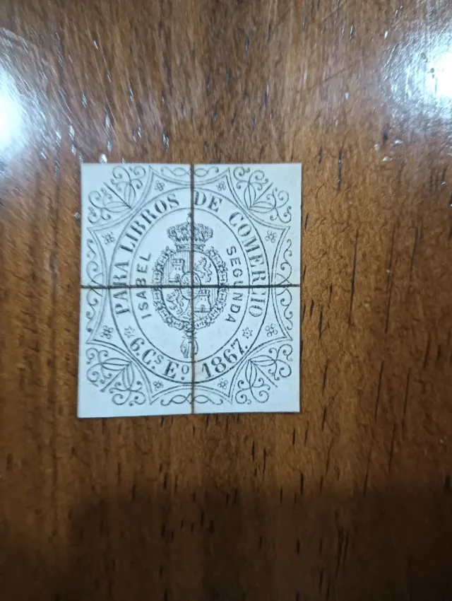 Sello fiscal de época, con diseño detallado y ornamental. - Inscripción Para Libros de Comercio. - Año 1867. - Representación de la corona real y escudo. - Detalle G.C. Eº.