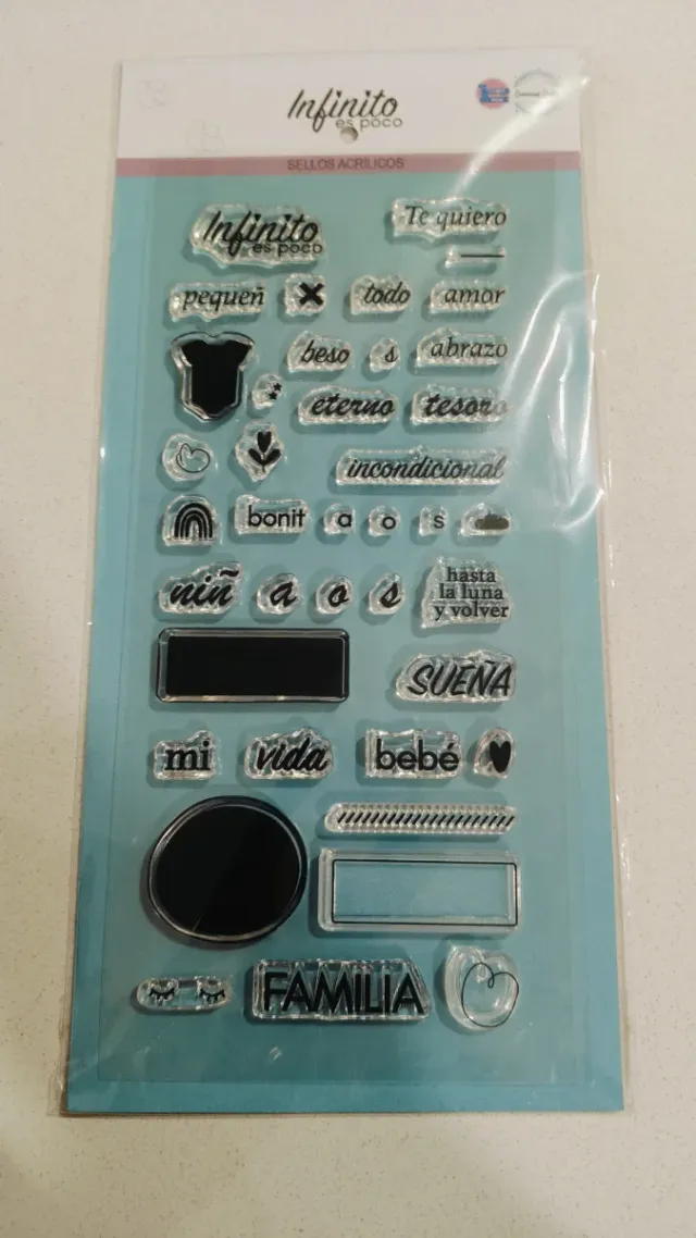 Detalles del productoSet de sellos acrílicos de la marca Infinito es poco. Incluye frases y figuras.