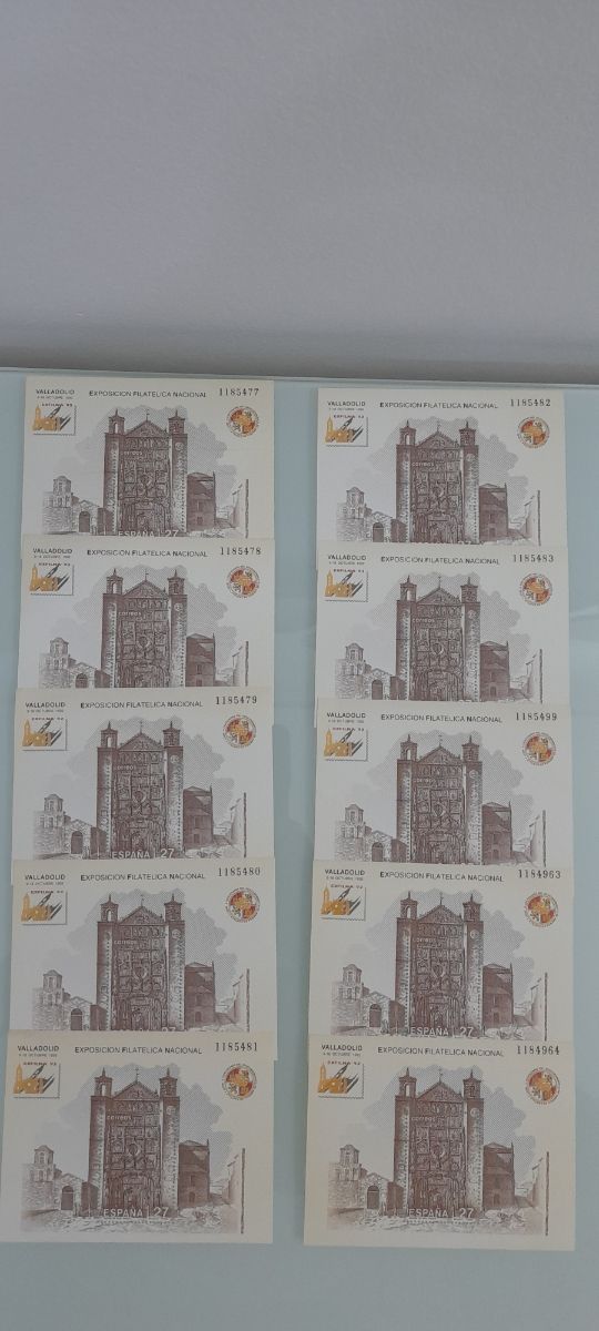 Lote 10 hojas bloque Exfilna-92 Exposición Filatelia Nacional Valladolid 9-18 Octubre 1992 hay siete de ellas correlativas 1185477-5483 todas nuevas son las de las fotografías.