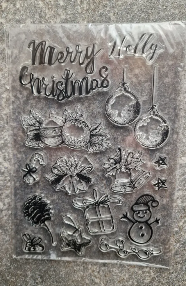 Set de sellos acrílicos con motivos navideños. - Incluye diseños de adornos, muñeco de nieve, regalos y más. - Ideales para manualidades y scrapbooking.