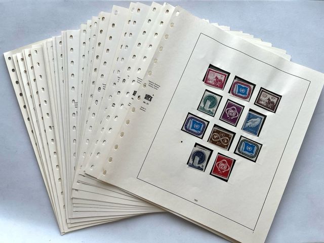 Sellos ONU New York 1951 - 64 + 1967 - 74 completo sin fijasellos en hojas marca SAFE de 14 anillas, colección de elevado valor filatélico. Sellos nuevos en perfecto estado de conservación, goma original MNH. Colección en 33 páginas.