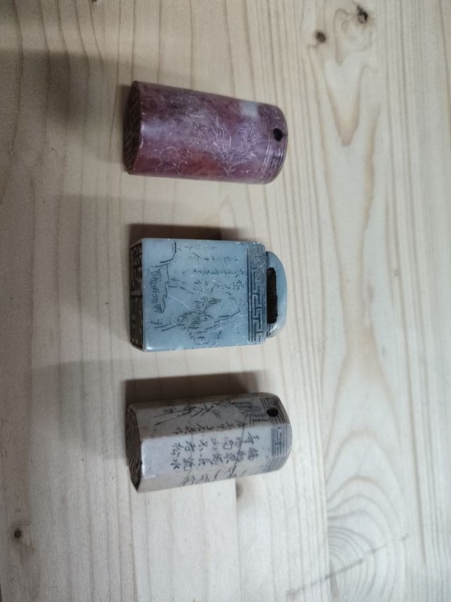 Conjunto de tres sellos orientales tallados en piedra con de orativos dibujos grabados.uno de forma exagonal, otro circular y otro rectangular.