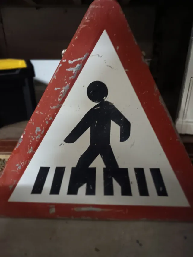 Detalles del productoSeñal de tráfico triangular antigua con borde rojo y fondo blanco.