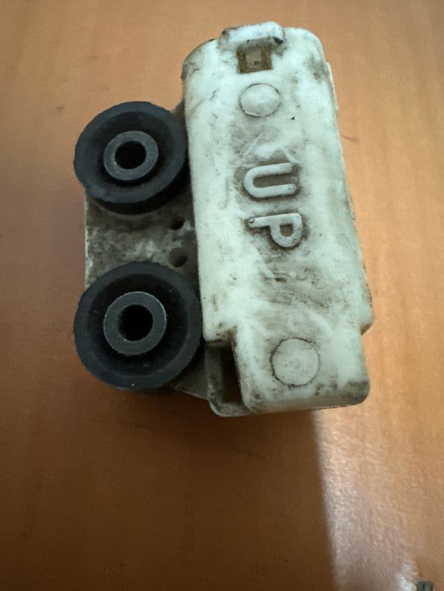 Sensor de caída para Piaggio X8 Cruiser. Pieza de plástico blanco con dos ruedas negras. - Indicación UP grabada en el plástico.