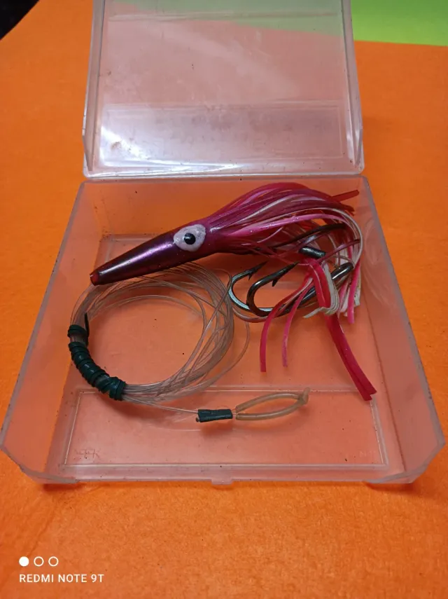 Detalles del productoSeñuelo de pesca con forma de calamar, ideal para la pesca deportiva. Incluye anzuelos y sedal.