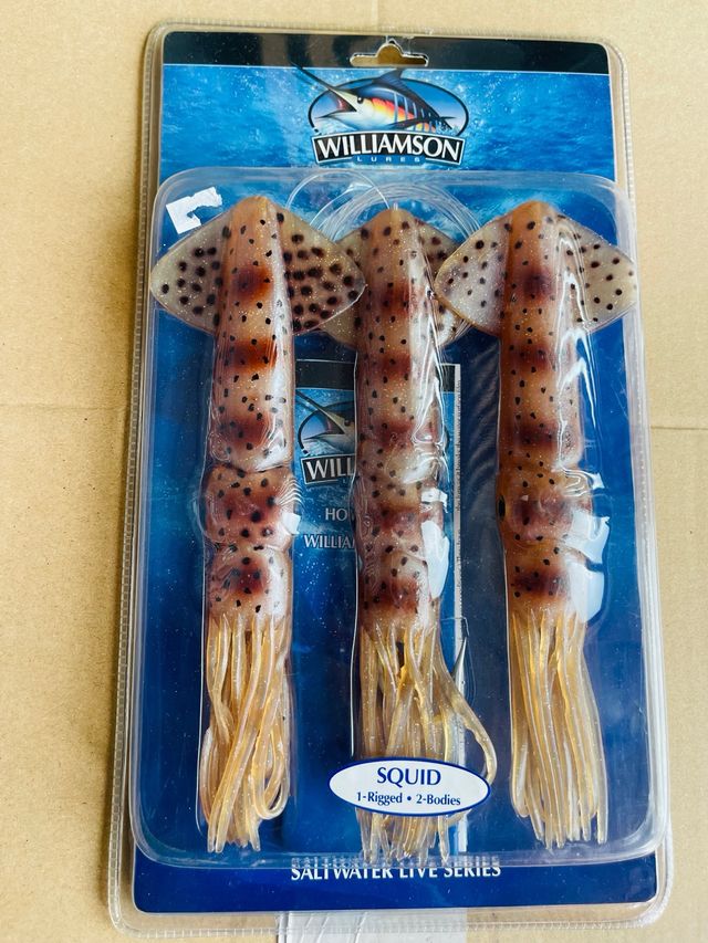 Velocidad de 2 a 8 nudos. Se venden 3 señuelos de pesca Williamson Squid, nuevos. Son ideales para la pesca de agua salada. Cada señuelo pesa