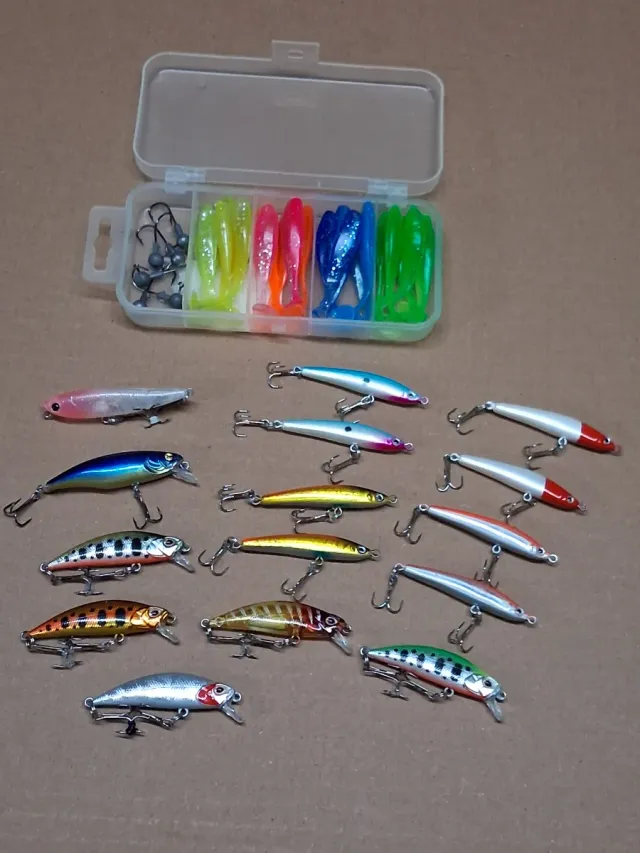 Detalles del productoConjunto de señuelos de pesca variados. Todo sin husar. 15 señuelos de entre 50mm y 65mm y entre 3 y 5 gramos y una caja con 50 vinilos de 55mm y 6 cabezas plomadas de 3 gramos.