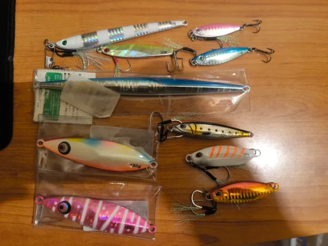 Detalles del productoLote de señuelos de pesca para la modalidad de jigging. Varios colores y pesos para diferentes condiciones de pesca.