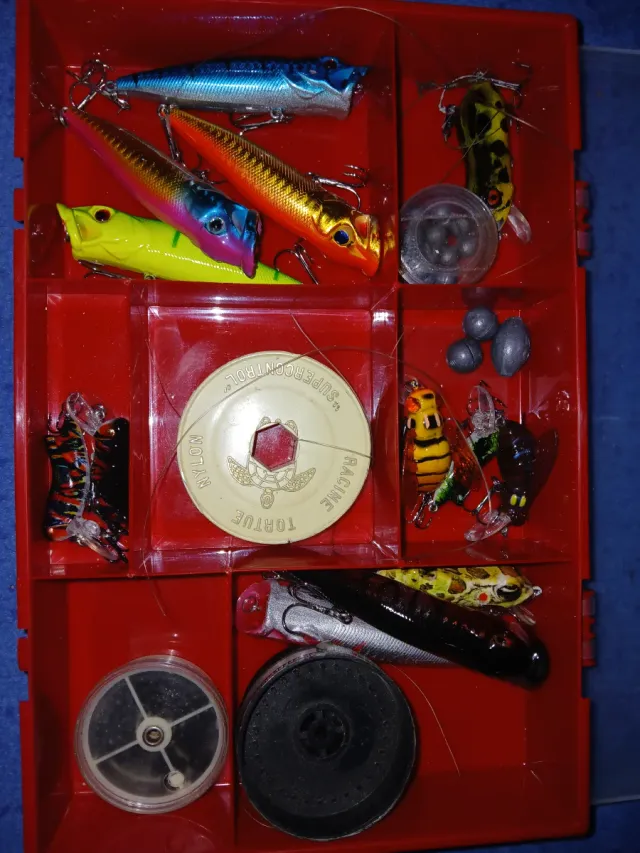 Detalles del productoLote de señuelos de pesca de diferentes tipos y colores.