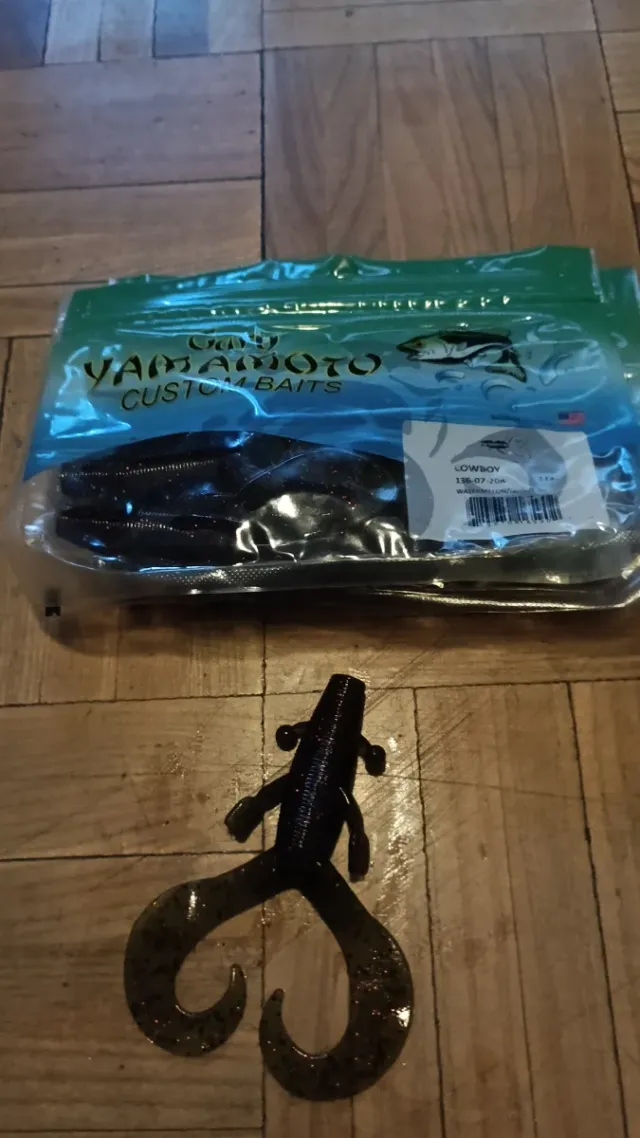 Lote de señuelos de pesca de la marca Gary Yamamoto Custom Baits. El color es oscuro, con destellos. - Modelo Cowboy. - Color 136-07 206. Precio por unidad