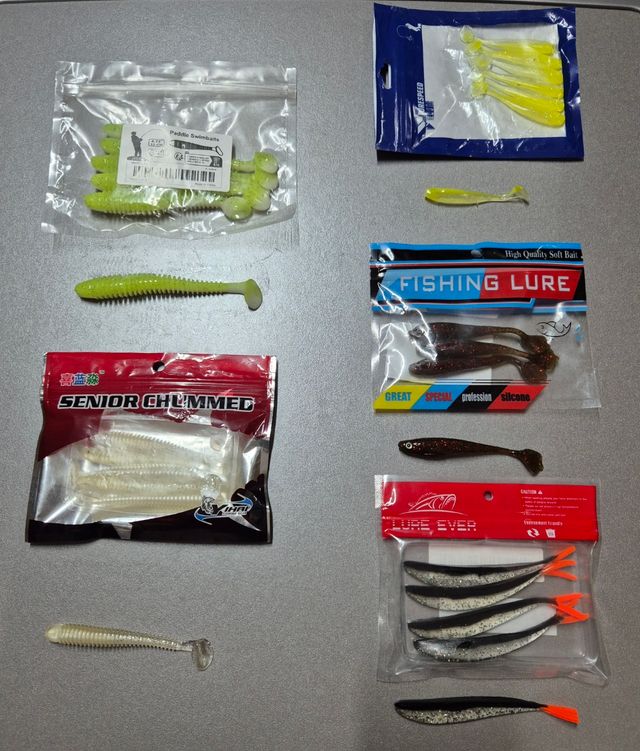 Vendo los siguientes lotes de paquetes de vinilos, anzuelos, hilo, para la pesca de depredadores. Cada foto es un lote, 10 euros cada lote. Black bass lucio lubina robalo baila
