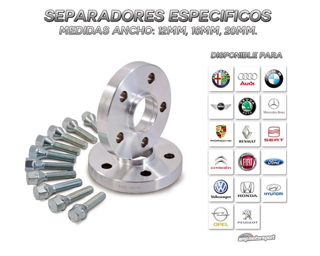 Separadores especificos para la mayoria de marcas de vehículos. Disponible en 12mm, 16mm y 20mm. El juego incluye 2 separadores y tornillos. Fabricados en aluminio macizo para mayor resistencia y ligereza. Mejor estética y estabilidad gracias al incremento de separación entre ejes. Separadores con doble centraje para evitar posibles vibraciones no deseadas. Montaje simple y rápido. Disponible para AUDI A3, A4, A5, A6, TT. BMW Serie 1 E87, F20, Serie 3, E30, E36, E46, E90, E92, F30, Serie 4, F32, Serie 5, E34, E39, E60, F10, Z3, Z4. Citroen, C2, C3, C4, DS3. Fiat. Ford, Focus, Mondeo, Fiesta, Ka, Escort. Mercedes,...