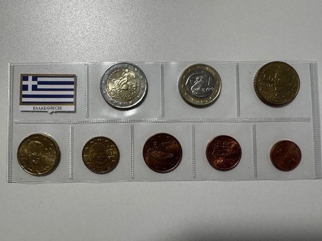 - Incluye la bandera de Grecia y varias denominaciones de céntimos y euros.