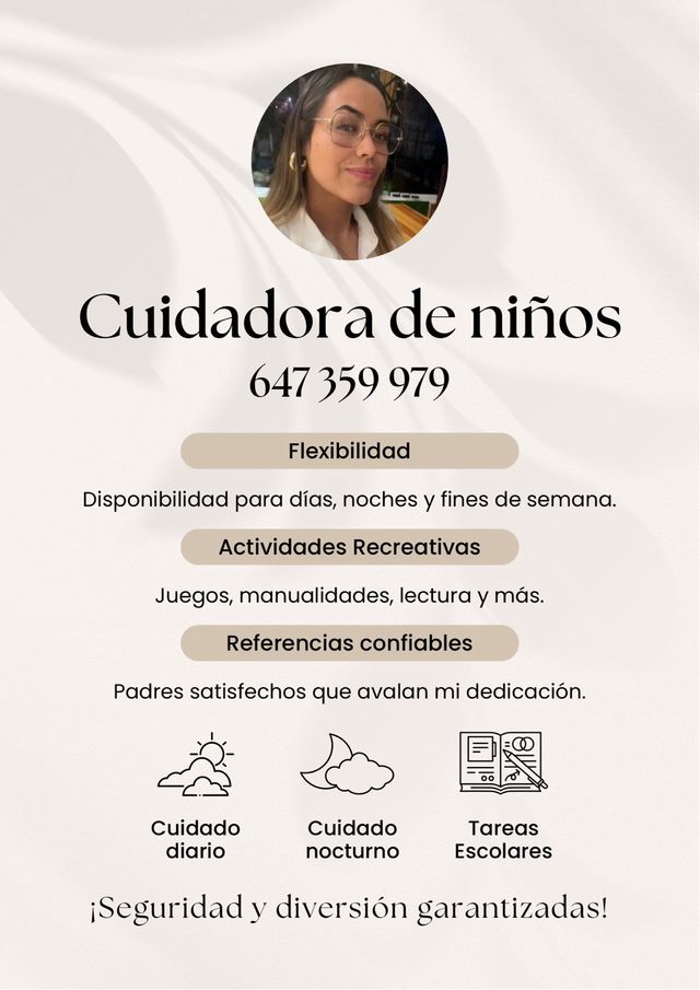 Detalles del productoSoy una persona responsable, dedicada y con experiencia en servicios de limpieza y cuidado de niños. Ofrezco un trabajo organizado, puntual y de confianza, adaptándome a las necesidades de cada familia u hogar. Cuento con habilidades para mantener espacios limpios, ordenados y agradables, así como para atender a niños con cariño, paciencia y atención.