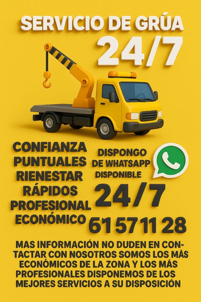 Detalles del productoServicio de grúa disponible 24/7. Ofrecemos un servicio profesional, rápido y económico. Contamos con personal puntual y de confianza.