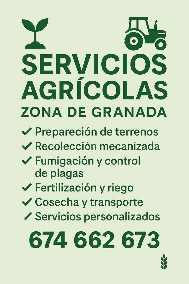 SE REALIZAN TODO TIPO DE SERVICIOS AGRÍCOLAS ,EN LA ZONA DE GRANADA PARA MAS INFORMACIÓN LLAME AL 674662673