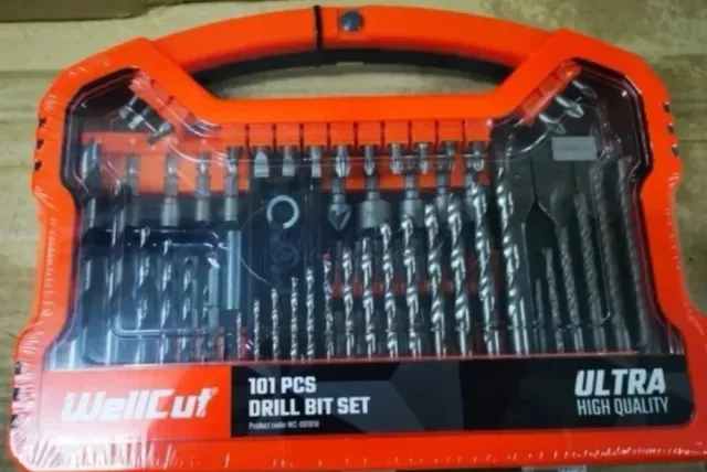 Maletin de 101 accesorios para atornillador y taladro, con puntas exagonales de 25 mm y de 50 mm torx, pozidrive (pz), philips (ph), planas, etc. Brocas para metal, cemento y madera, y unos topes para tarugar.