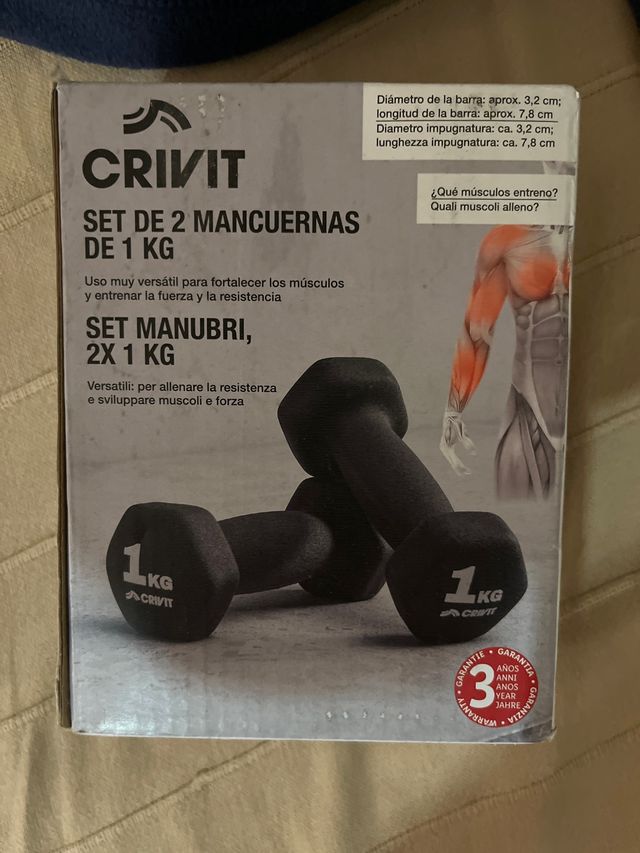 Detalles del productoSet de dos mancuernas Crivit de 1 kg cada una. Ideales para entrenar la fuerza y la resistencia.