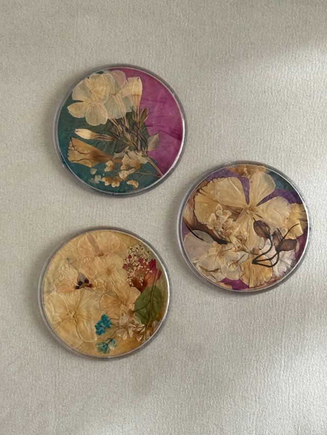 Detalles del productoConjunto de tres imanes artesanales con flores secas prensadas.