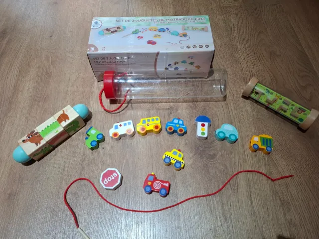 Detalles del productoSet de 3 juguetes de madera para desarrollar la motricidad fina.