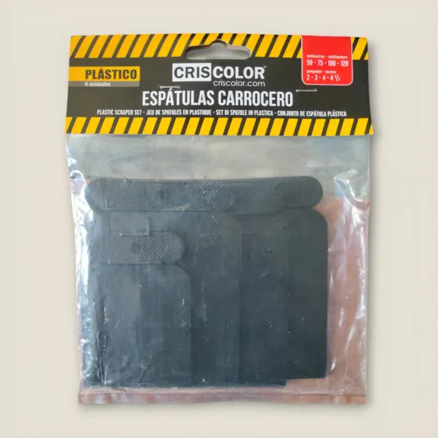 Set de 4 espátulas de plástico de la marca Cris Color. - Material: Plástico. - Incluye 4 unidades. - Medidas: 50, 75, 100 y 120 mm (2, 3, 4 y 4 1/2 pulgadas).