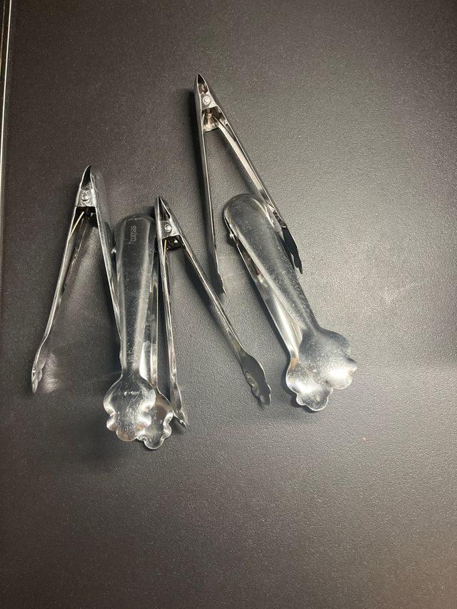 Detalles del productoConjunto de cinco pinzas de cocina fabricadas en acero inoxidable. Son ideales para servir o manipular alimentos.