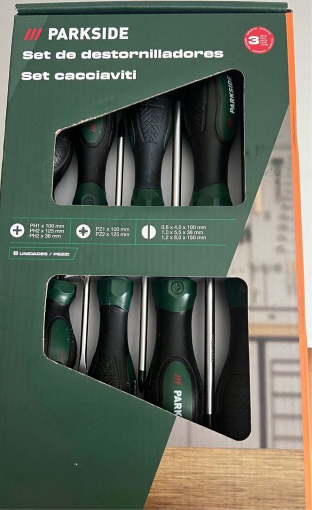 - Medidas: PH1 x 100 mm, PH2 x 125 mm, PH2 x 38 mm, PZ1 x 100 mm, PZ2 x 125 mm, 0.8 x 4.0 x 100 mm, 1.0 x 5.5 x 38 mm, 1.2 x 8.0 x 150 mm.