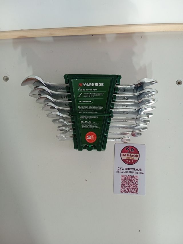 Detalles del producto✅Set de 8 llaves fijas de la marca Parkside. Vienen en un práctico soporte de plástico que permite su montaje en la pared.